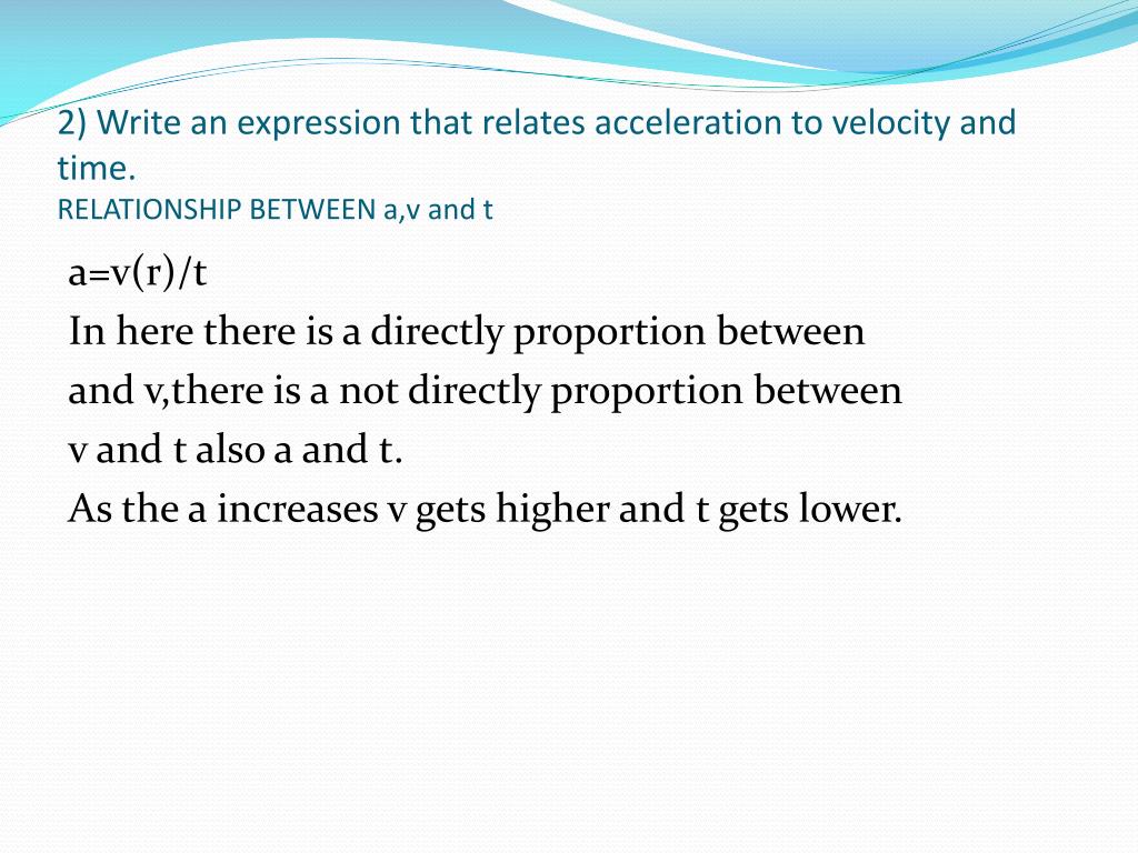2) Write an expression that relates acceleration to velocity and time.RELATIONSHIP BETWEEN a,v and t a=v(r)/t In here there is a directly proportion between and v,there is a not directly proportion between v and t also a and t. As the a increases v gets higher and t gets lower.