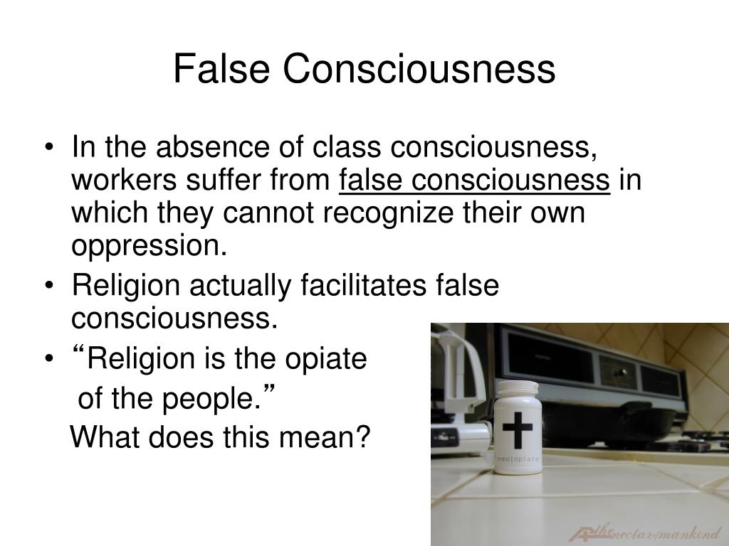 False Consciousness • In the absence of class consciousness, workers suffer from false consciousness in which they cannot recognize their own oppression. • Religion actually facilitates false consciousness. • “Religion is the opiate of the people.” What does this mean?