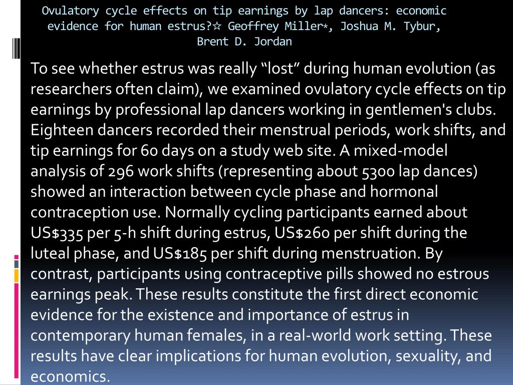 Ovulatory cycle effects on tip earnings by lap dancers: economic evidence for human estrus?☆ Geoffrey Miller⁎, Joshua M. Tybur, Brent D. Jordan To see whether estrus was really “lost” during human evolution (as researchers often claim), we examined ovulatory cycle effects on tip earnings by professional lap dancers working in gentlemen's clubs. Eighteen dancers recorded their menstrual periods, work shifts, and tip earnings for 60 days on a study web site. A mixed-model analysis of 296 work shifts (representing about 5300 lap dances) showed an interaction between cycle phase and hormonal contraception use. Normally cycling participants earned about US$335 per 5-h shift during estrus, US$260 per shift during the luteal phase, and US$185 per shift during menstruation. By contrast, participants using contraceptive pills showed no estrous earnings peak. These results constitute the first direct economic evidence for the existence and importance of estrusin contemporary human females, in a real-world work setting. These results have clear implications for human evolution, sexuality, and economics.