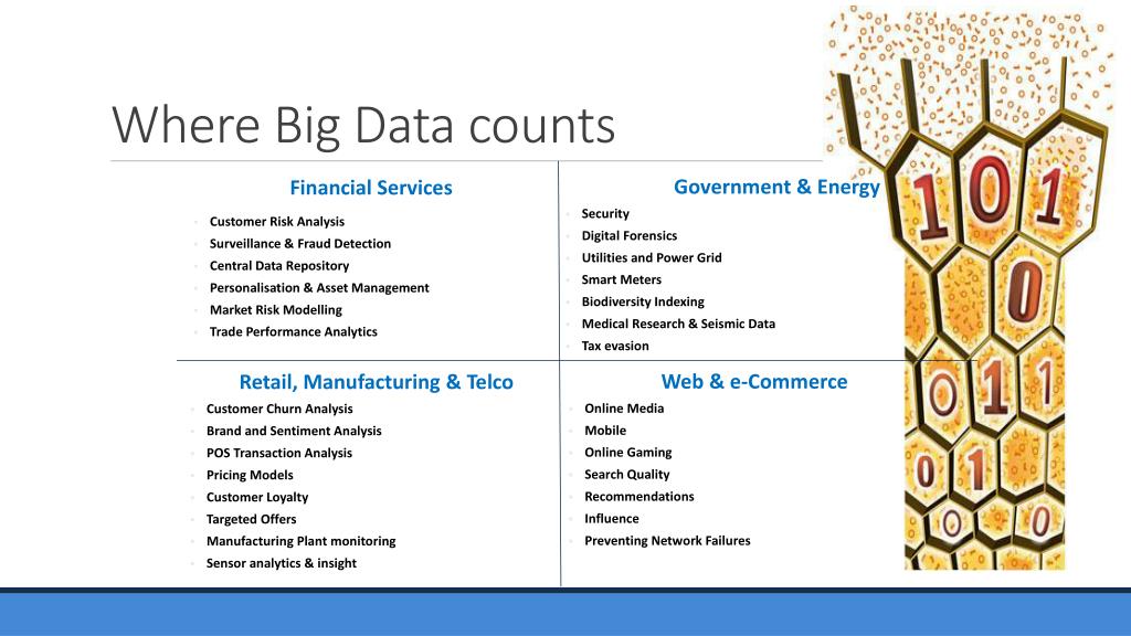 Where Big Data counts Financial Services • Customer Risk Analysis • Surveillance & Fraud Detection • Central Data Repository • Personalisation & Asset Management • Market Risk Modelling • Trade Performance Analytics Government& Energy • Security • Digital Forensics • Utilities and Power Grid • Smart Meters • Biodiversity Indexing • Medical Research & Seismic Data • Tax evasion Web & e-Commerce • Online Media • Mobile • Online Gaming • Search Quality • Recommendations • Influence • Preventing Network Failures Retail, Manufacturing & Telco • Customer Churn Analysis • Brand and Sentiment Analysis • POS Transaction Analysis • Pricing Models • Customer Loyalty • Targeted Offers • Manufacturing Plant monitoring • Sensor analytics & insight