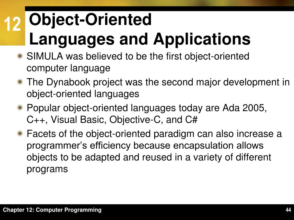 Object-Oriented Languages and Applications • SIMULA was believed to be the first object-oriented computer language • The Dynabook project was the second major development in object-oriented languages • Popular object-oriented languages today are Ada 2005, C++, Visual Basic, Objective-C, and C# • Facets of the object-oriented paradigm can also increase a programmer’s efficiency because encapsulation allows objects to be adapted and reused in a variety of different programs Chapter 12: Computer Programming