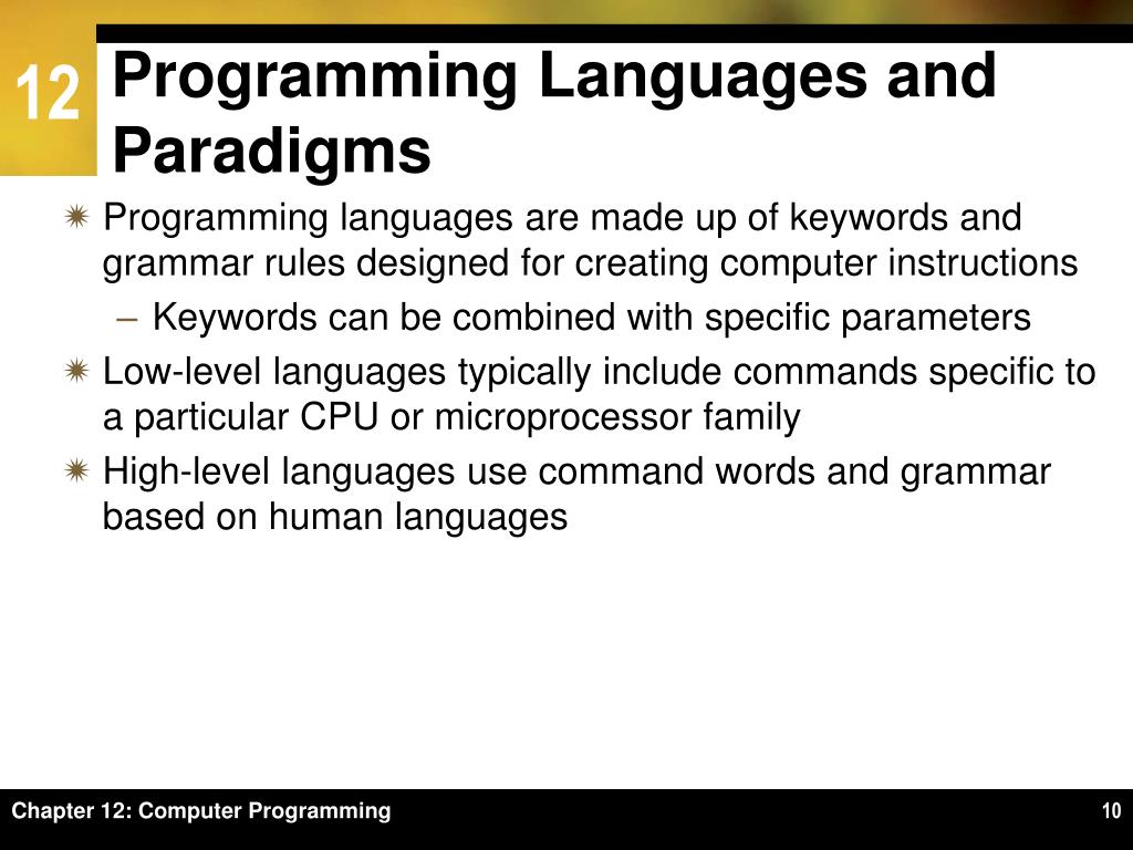Programming Languages and Paradigms • Programming languages are made up of keywords and grammar rules designed for creating computer instructions • Keywords can be combined with specific parameters • Low-level languages typically include commands specific to a particular CPU or microprocessor family • High-level languages use command words and grammar based on human languages Chapter 12: Computer Programming