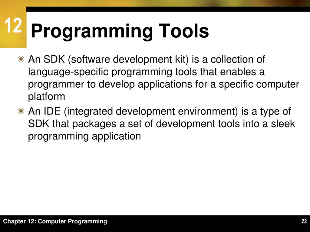 Programming Tools • An SDK (software development kit) is a collection of language-specific programming tools that enables a programmer to develop applications for a specific computer platform • An IDE (integrated development environment) is a type of SDK that packages a set of development tools into a sleek programming application Chapter 12: Computer Programming