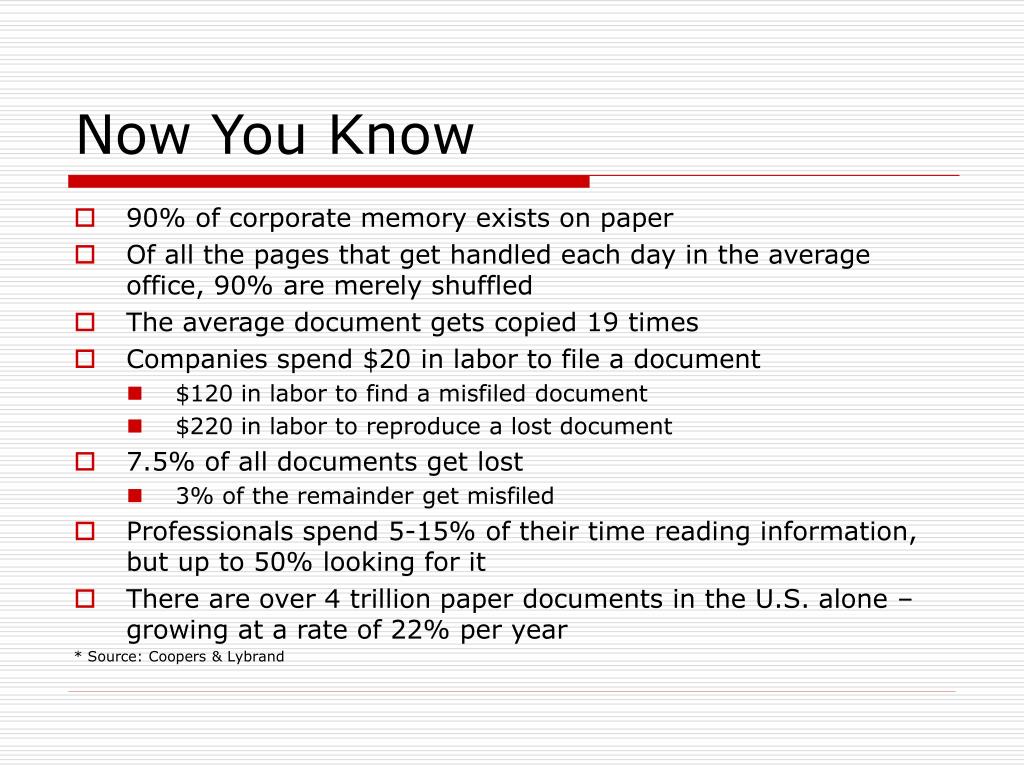 Now You Know • 90% of corporate memory exists on paper • Of all the pages that get handled each day in the average office, 90% are merely shuffled • The average document gets copied 19 times • Companies spend $20 in labor to file a document • $120 in labor to find a misfiled document • $220 in labor to reproduce a lost document • 7.5% of all documents get lost • 3% of the remainder get misfiled • Professionals spend 5-15% of their time reading information, but up to 50% looking for it • There are over 4 trillion paper documents in the U.S. alone – growing at a rate of 22% per year * Source: Coopers & Lybrand