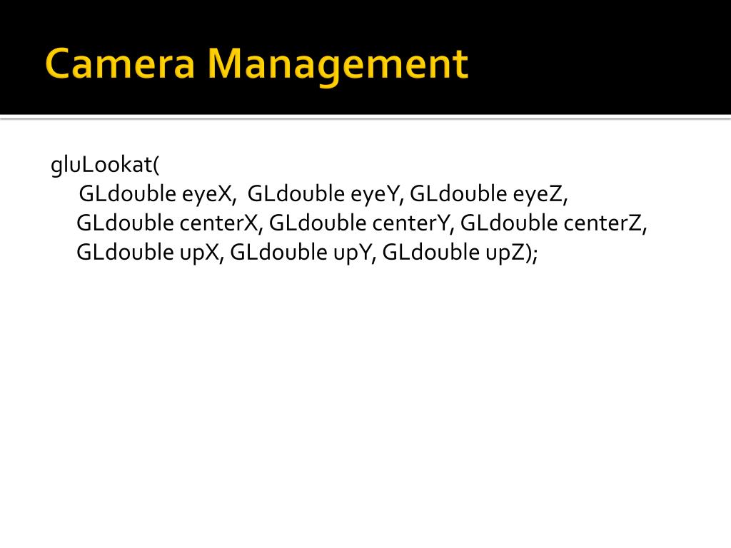 Camera Management gluLookat( GLdouble eyeX, GLdouble eyeY, GLdouble eyeZ, GLdouble centerX, GLdouble centerY, GLdouble centerZ, GLdouble upX, GLdouble upY, GLdouble upZ);