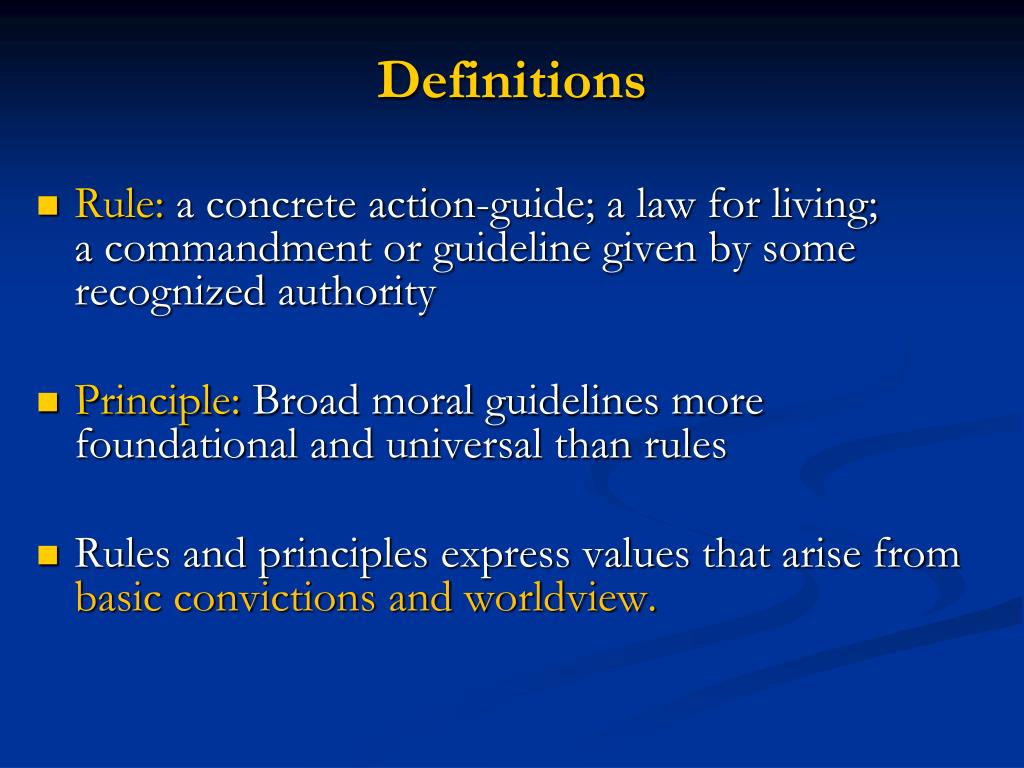 Definitions • Rule: a concrete action-guide; a law for living; a commandment or guideline given by some recognized authority • Principle: Broad moral guidelines more foundational and universal than rules • Rules and principles express values that arise from basic convictions and worldview.