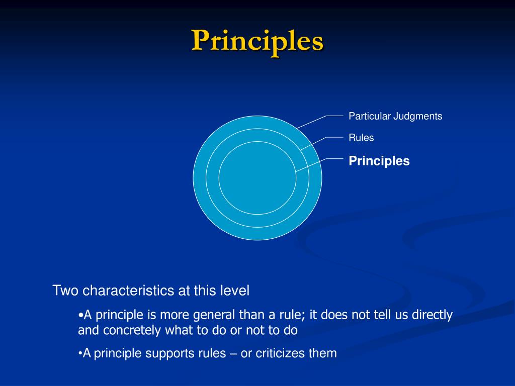 Principles Particular Judgments Rules Principles • Two characteristics at this level • A principle is more general than a rule; it does not tell us directly and concretely what to do or not to do • A principle supports rules – or criticizes them