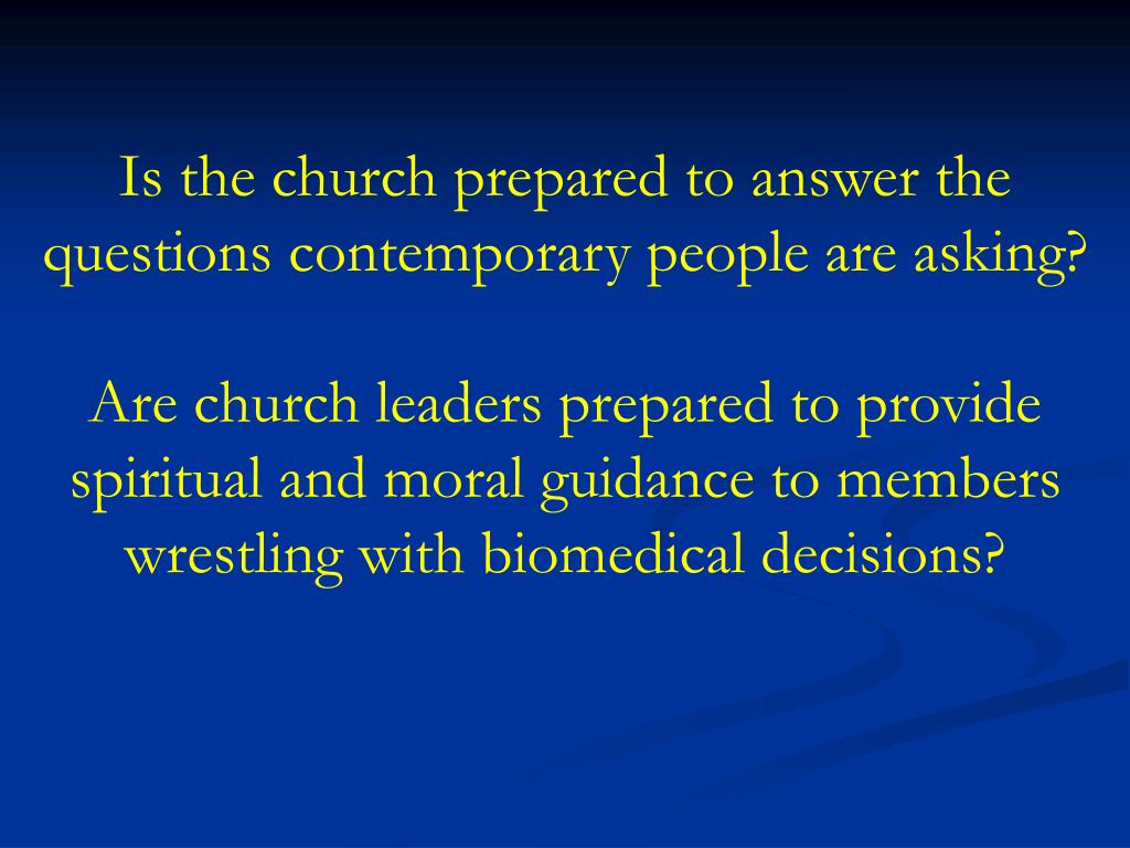 Is the church prepared to answer the questions contemporary people are asking? Are church leaders prepared to provide spiritual and moral guidance to members wrestling with biomedical decisions?