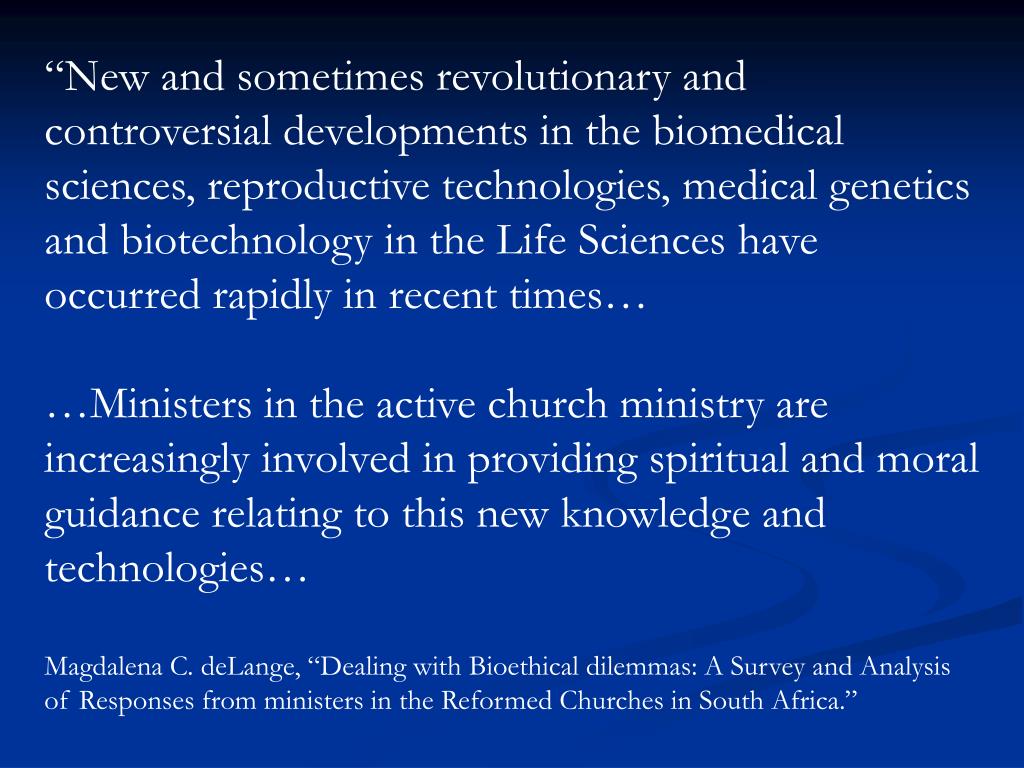 “New and sometimes revolutionary and controversial developments in the biomedical sciences, reproductive technologies, medical genetics and biotechnology in the Life Sciences have occurred rapidly in recent times… …Ministers in the active church ministry are increasingly involved in providing spiritual and moral guidance relating to this new knowledge and technologies… Magdalena C. deLange, “Dealing with Bioethical dilemmas: A Survey and Analysis of Responses from ministers in the Reformed Churches in South Africa.”