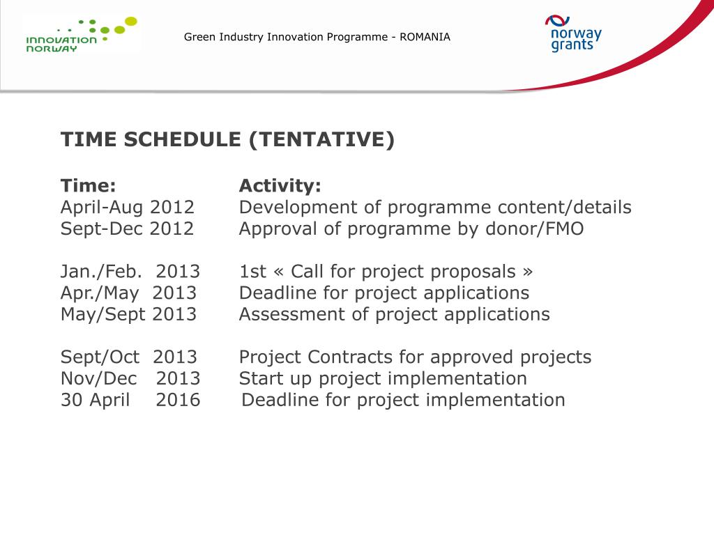 Green Industry Innovation Programme - ROMANIA TIME SCHEDULE (TENTATIVE) Time: Activity: April-Aug 2012 Development of programme content/details Sept-Dec 2012 Approval of programme by donor/FMO Jan./Feb. 2013 1st « Call for projectproposals » Apr./May 2013 Deadline for project applications May/Sept 2013 Assessment of project applications Sept/Oct 2013 Project Contracts for approvedprojects Nov/Dec 2013 Start up projectimplementation 30 April 2016 Deadline for projectimplementation