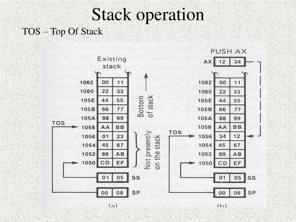 PUSH and POP • PUSH and POP are used to stored data onto the stack. Stack is used as a temporary storage • When performing PUSH AX ; value of AH is stored in SP-1, value of AL is stored in SP-2, the new value of SP is SP-2 • SP – stack pointer (offset) • During a POP AX • Content of SP is stored in AL • Content of SP+1 is stored in AH • New value of SP is SP+2