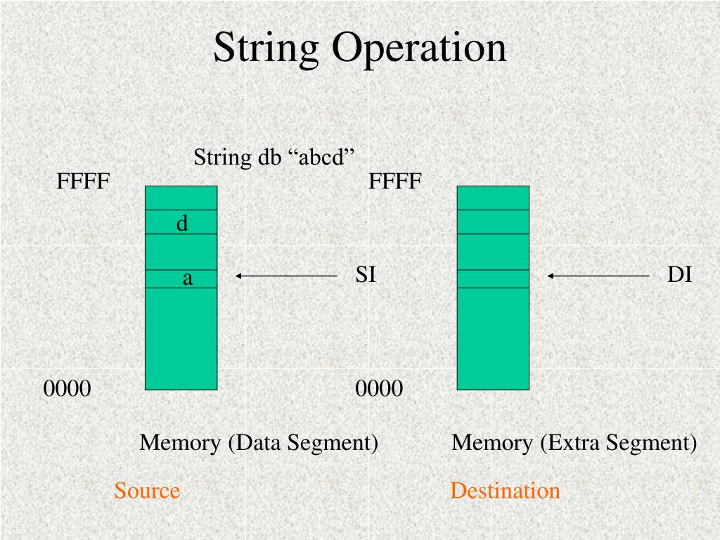FFFF FFFF d SI DI a 0000 0000 Memory (Data Segment) Memory (Extra Segment) String Operation String db “abcd” Source Destination