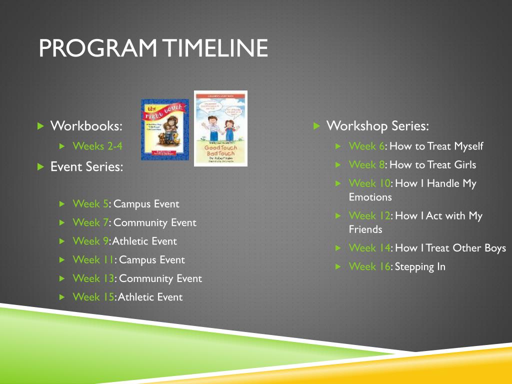 Program timeline • Workbooks: • Weeks 2-4 • Event Series: • Week 5: Campus Event • Week 7: Community Event • Week 9: Athletic Event • Week 11: Campus Event • Week 13: Community Event • Week 15:Athletic Event • Workshop Series: • Week 6: How to Treat Myself • Week 8: How to Treat Girls • Week 10: How I Handle My Emotions • Week 12: How I Act with My Friends • Week 14: How I Treat Other Boys • Week 16: Stepping In