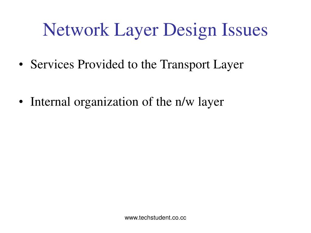 Network Layer Design Issues • Services Provided to the Transport Layer • Internal organization of the n/w layer www.techstudent.co.cc