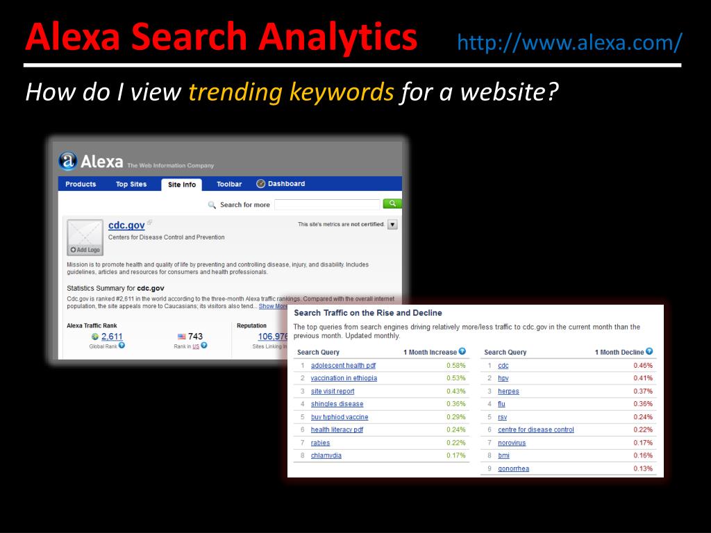 Alexa Search Analytics http://www.alexa.com/ How do I view trending keywords for a website?