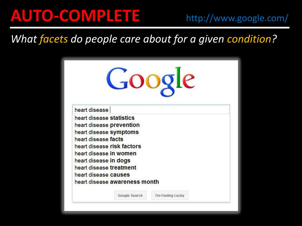AUTO-COMPLETE http://www.google.com/ What facets do people care about for a given condition?
