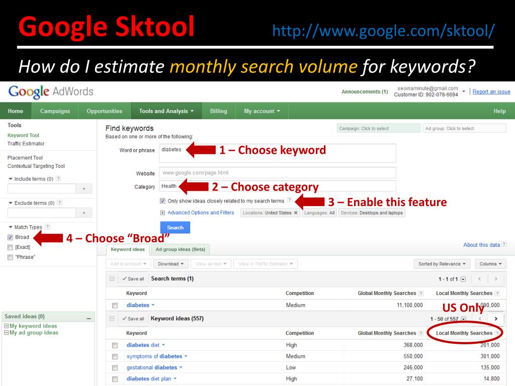 Google Sktoolhttp://www.google.com/sktool/ 1 – Choose keyword 2 – Choose category 3 – Enable this feature How do I estimate monthly search volume for keywords? 4 – Choose “Broad” US Only