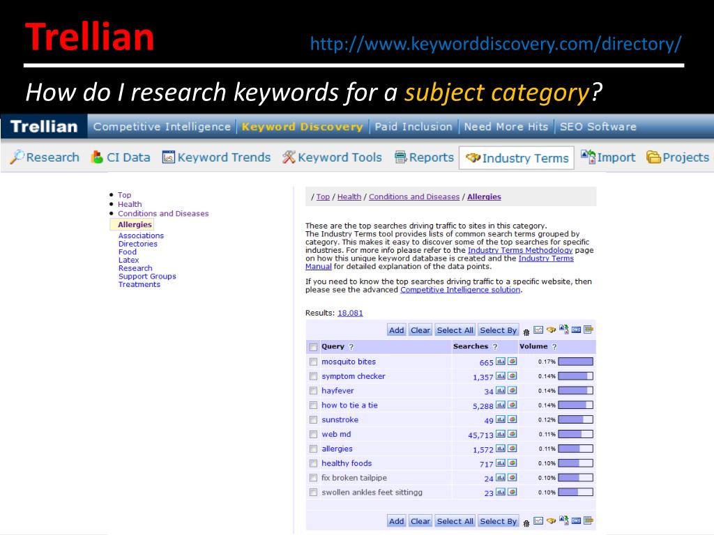 Trellianhttp://www.keyworddiscovery.com/directory/ How do I research keywords for a subject category?