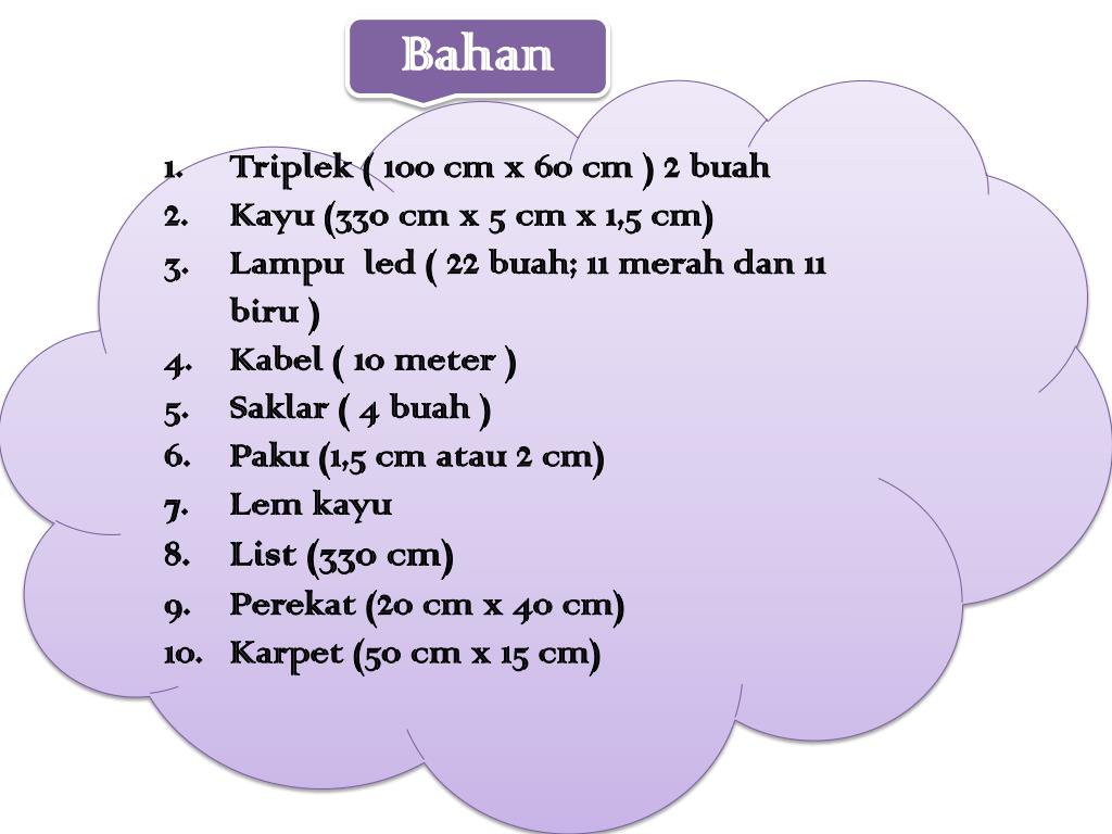 Bahan 1. Triplek( 100 cm x 60 cm ) 2 buah 2. Kayu(330 cm x 5 cm x 1,5 cm) 3. Lampu led ( 22 buah; 11 merahdan 11 biru ) 4. Kabel( 10 meter ) 5. Saklar( 4 buah ) 6. Paku(1,5 cm atau 2 cm) Lem kayu List (330 cm) 9. Perekat(20 cm x 40 cm) 10. Karpet(50 cm x 15 cm)