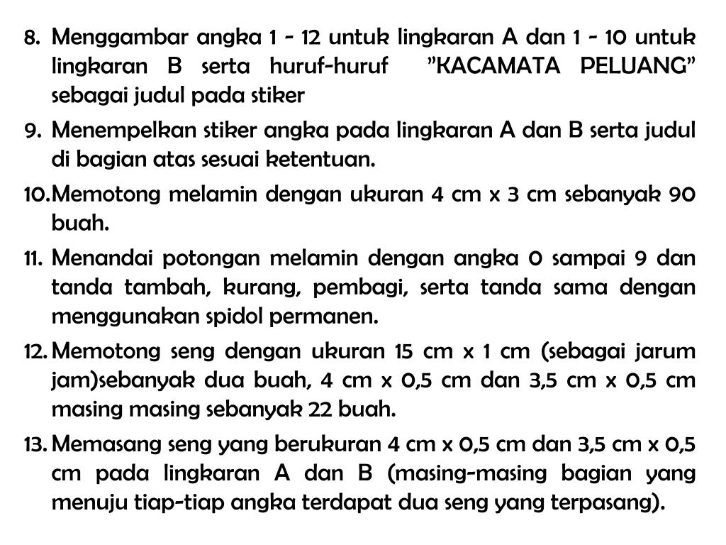 8. Menggambarangka 1 - 12 untuklingkaran A dan 1 - 10 untuklingkaran B sertahuruf-huruf ”KACAMATA PELUANG” sebagaijudulpadastiker 9. Menempelkanstikerangkapadalingkaran A dan B sertajuduldibagianatassesuaiketentuan. 10. Memotongmelamindenganukuran 4 cm x 3 cm sebanyak 90 buah. 11. Menandaipotonganmelamindenganangka 0 sampai 9 dantandatambah, kurang, pembagi, sertatandasamadenganmenggunakanspidolpermanen. 12. Memotongsengdenganukuran 15 cm x 1 cm (sebagaijarum jam)sebanyakduabuah, 4 cm x 0,5 cm dan 3,5 cm x 0,5 cm masingmasingsebanyak 22 buah. 13. Memasangseng yang berukuran 4 cm x 0,5 cm dan 3,5 cm x 0,5 cm padalingkaran A dan B (masing-masingbagian yang menujutiap-tiapangkaterdapatduaseng yang terpasang).