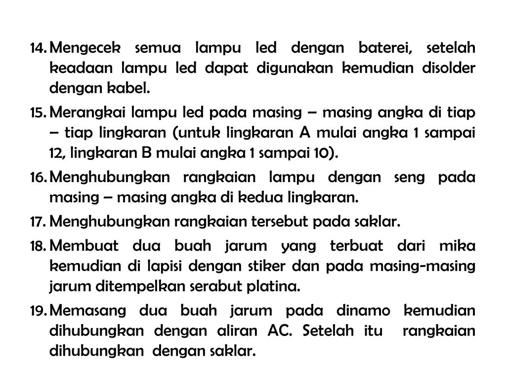14. Mengeceksemualampu led denganbaterei, setelahkeadaanlampu led dapatdigunakankemudiandisolderdengankabel. 15. Merangkailampu led padamasing – masingangkaditiap – tiaplingkaran (untuklingkaran A mulaiangka 1 sampai 12, lingkaran B mulaiangka 1 sampai 10). 16. Menghubungkanrangkaianlampudengansengpadamasing – masingangkadikedualingkaran. 17. Menghubungkanrangkaiantersebutpadasaklar. 18. Membuatduabuahjarum yang terbuatdarimikakemudiandilapisidenganstikerdanpadamasing-masingjarumditempelkanserabutplatina. 19. Memasangduabuahjarumpadadinamokemudiandihubungkandenganaliran AC. Setelahiturangkaiandihubungkandengansaklar.