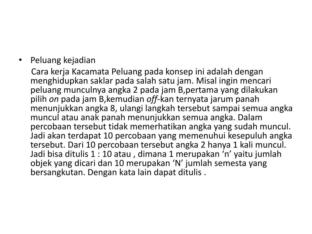 Peluangkejadian Cara kerjaKacamataPeluangpadakonsepiniadalahdenganmenghidupkansaklarpadasalahsatujam. Misal ingin mencari peluang munculnya angka 2 pada jam B,pertama yang dilakukan pilih on pada jam B,kemudian off-kan ternyata jarum panah menunjukkan angka 8, ulangi langkah tersebut sampai semua angka muncul atau anak panah menunjukkan semua angka. Dalam percobaan tersebut tidak memerhatikan angka yang sudah muncul. Jadi akan terdapat 10 percobaan yang memenuhui kesepuluh angka tersebut. Dari 10 percobaan tersebut angka 2 hanya 1 kali muncul. Jadi bisa ditulis 1 : 10 atau , dimana 1 merupakan ‘n’ yaitu jumlah objek yang dicari dan 10 merupakan ‘N’ jumlah semesta yang bersangkutan. Dengan kata lain dapat ditulis .