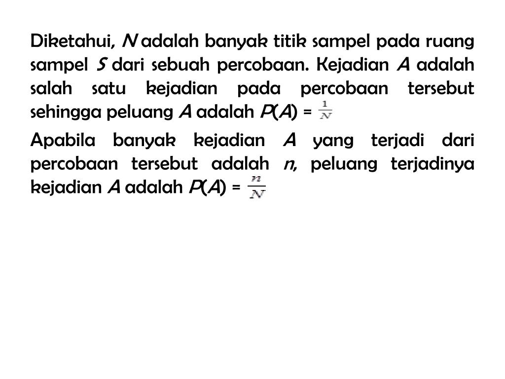 Diketahui, N adalahbanyaktitiksampelpadaruangsampelS darisebuahpercobaan. KejadianA adalahsalahsatukejadianpadapercobaantersebutsehinggapeluangAadalahP(A) = ApabilabanyakkejadianA yang terjadidaripercobaantersebutadalahn, peluangterjadinyakejadianA adalahP(A) =