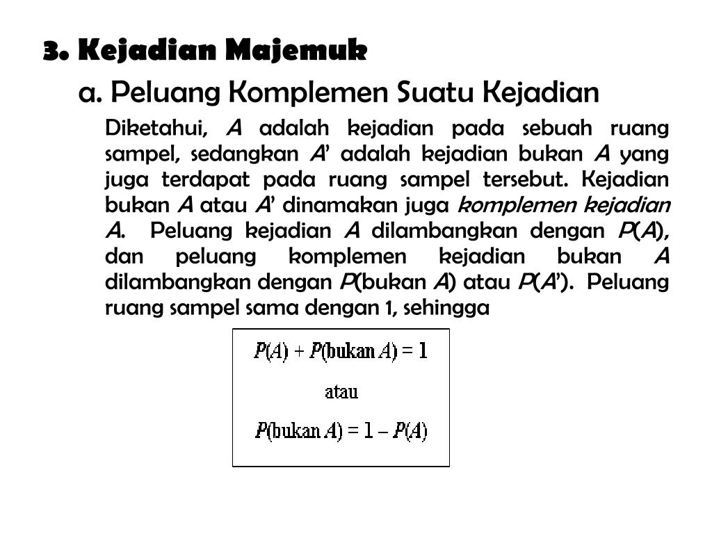 3. KejadianMajemuk a. Peluang Komplemen Suatu Kejadian Diketahui, A adalah kejadian pada sebuah ruang sampel, sedangkan A’ adalah kejadian bukan A yang juga terdapat pada ruang sampel tersebut. Kejadian bukan A atau A’ dinamakan juga komplemen kejadian A. Peluang kejadian A dilambangkan dengan P(A), dan peluang komplemen kejadian bukan A dilambangkan dengan P(bukan A) atau P(A’). Peluang ruang sampel sama dengan 1, sehingga