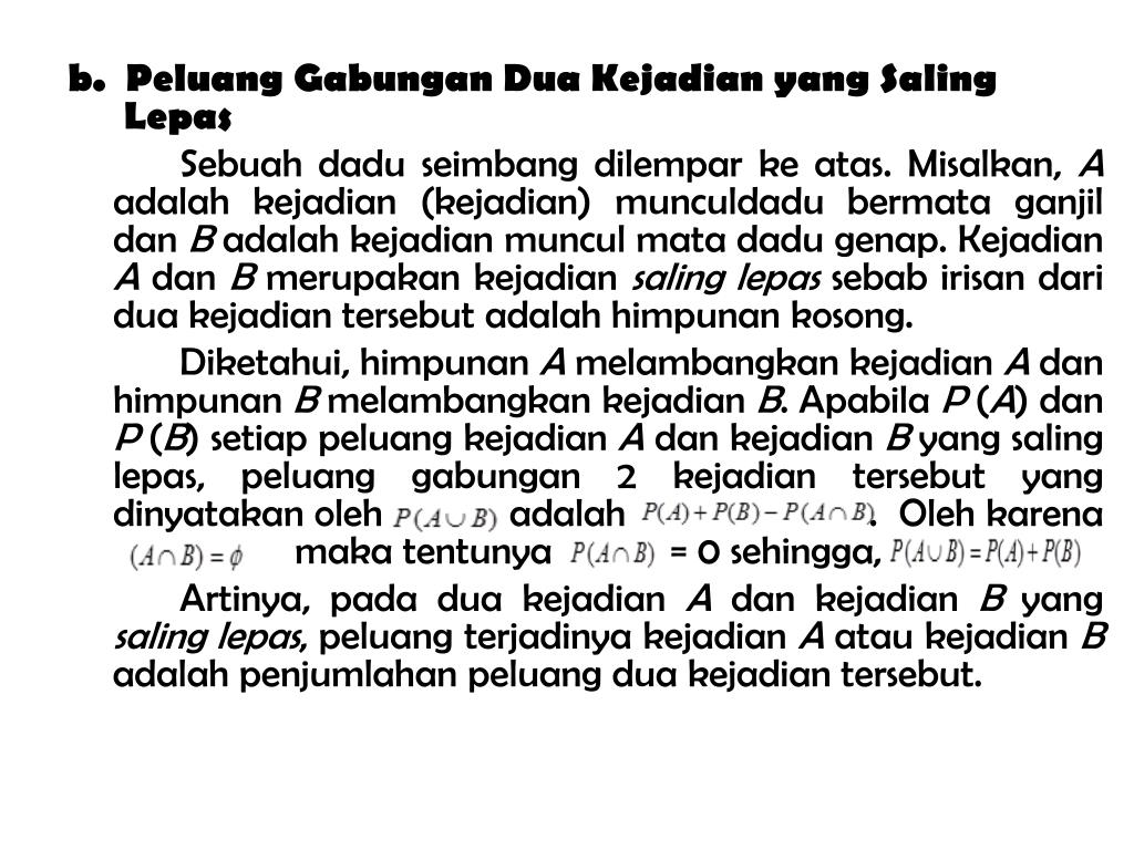 b. PeluangGabunganDuaKejadian yang SalingLepas Sebuah dadu seimbang dilempar ke atas. Misalkan, A adalah kejadian (kejadian) munculdadu bermata ganjil dan B adalah kejadian muncul mata dadu genap. Kejadian A dan B merupakan kejadian saling lepas sebab irisan dari dua kejadian tersebut adalah himpunan kosong. Diketahui, himpunan A melambangkan kejadian A dan himpunan B melambangkan kejadian B. Apabila P(A) dan P(B) setiap peluang kejadian A dan kejadian B yang saling lepas, peluang gabungan 2 kejadian tersebut yang dinyatakan olehadalah.Oleh karenamaka tentunya= 0 sehingga, Artinya, pada dua kejadian A dan kejadian B yang saling lepas, peluang terjadinya kejadian A atau kejadian B adalah penjumlahan peluang dua kejadian tersebut.