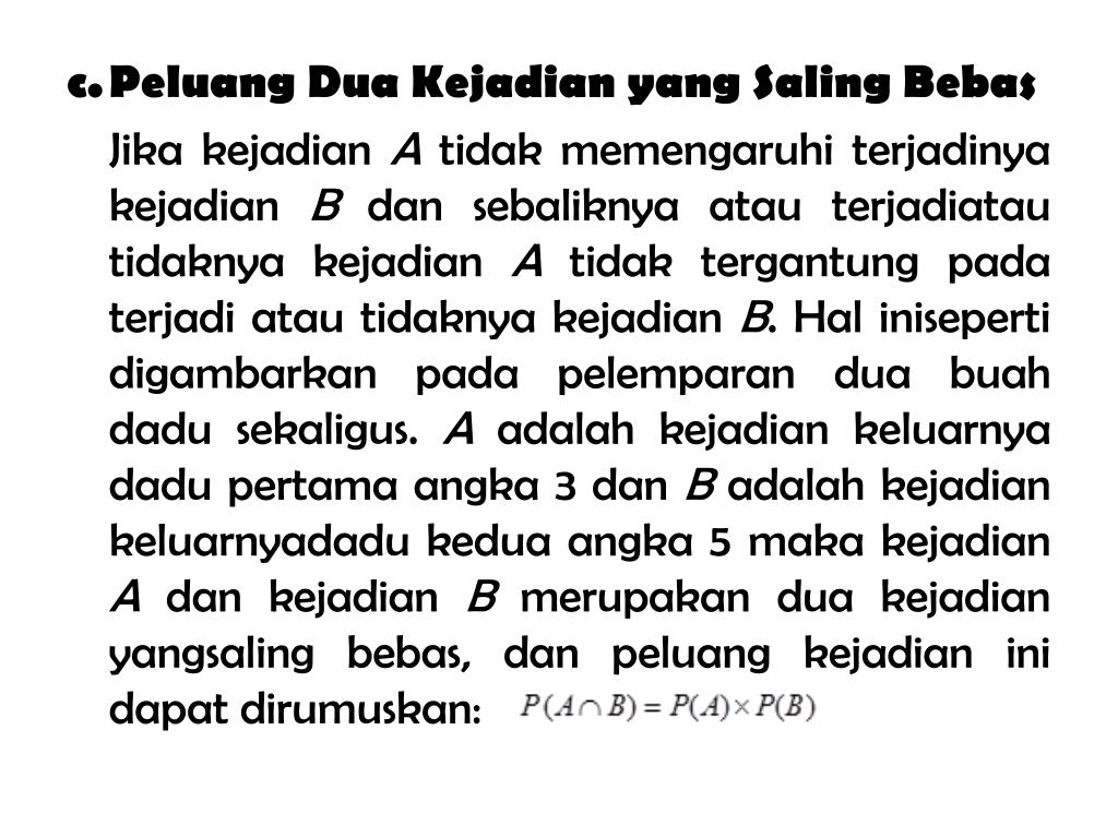 c. Peluang Dua Kejadian yang Saling Bebas Jika kejadian A tidak memengaruhi terjadinya kejadian B dan sebaliknya atau terjadiatau tidaknya kejadian A tidak tergantung pada terjadi atau tidaknya kejadian B. Hal iniseperti digambarkan pada pelemparan dua buah dadu sekaligus. A adalah kejadian keluarnya dadu pertama angka 3 dan B adalah kejadian keluarnyadadu kedua angka 5 maka kejadian A dan kejadian B merupakan dua kejadian yangsaling bebas, dan peluang kejadian ini dapat dirumuskan: