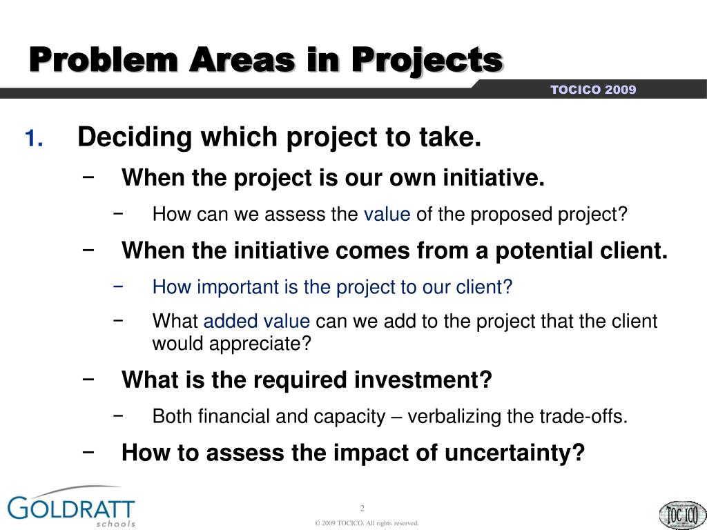 Problem Areas in Projects • Deciding which project to take. • When the project is our own initiative. • How can we assess the value of the proposed project? • When the initiative comes from a potential client. • How important is the project to our client? • What added value can we add to the project that the client would appreciate? • What is the required investment? • Both financial and capacity – verbalizing the trade-offs. • How to assess the impact of uncertainty?
