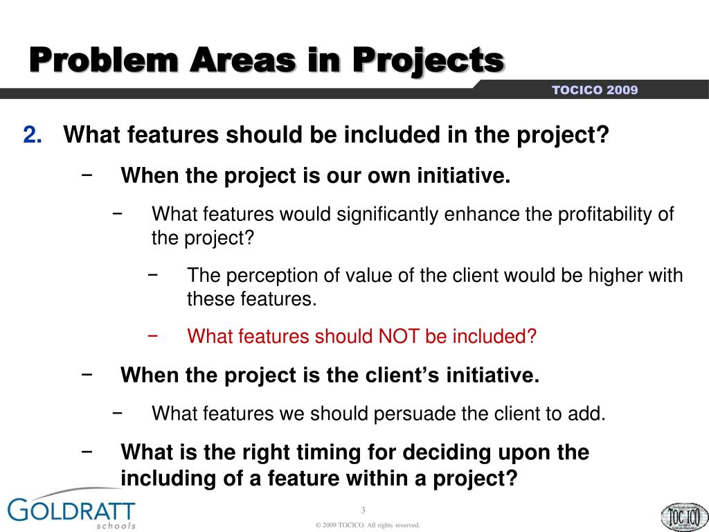 Problem Areas in Projects • What features should be included in the project? • When the project is our own initiative. • What features would significantly enhance the profitability of the project? • The perception of value of the client would be higher with these features. • What features should NOT be included? • When the project is the client’s initiative. • What features we should persuade the client to add. • What is the right timing for deciding upon the including of a feature within a project?