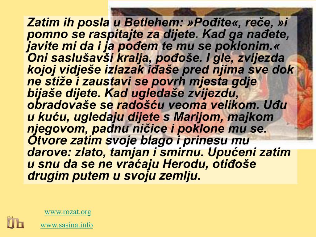 Zatim ih posla u Betlehem: »Pođite«, reče, »i pomno se raspitajte za dijete. Kad ga nađete, javite mi da i ja pođem te mu se poklonim.« Oni saslušavši kralja, pođoše. I gle, zvijezda kojoj vidješe izlazak iđaše pred njima sve dok ne stiže i zaustavi se povrh mjesta gdje bijaše dijete. Kad ugledaše zvijezdu, obradovaše se radošću veoma velikom. Uđu u kuću, ugledaju dijete s Marijom, majkom njegovom, padnu ničice i poklone mu se. Otvore zatim svoje blago i prinesu mu darove: zlato, tamjan i smirnu. Upućeni zatim u snu da se ne vraćaju Herodu, otiđoše drugim putem u svoju zemlju. www.rozat.org www.sasina.info