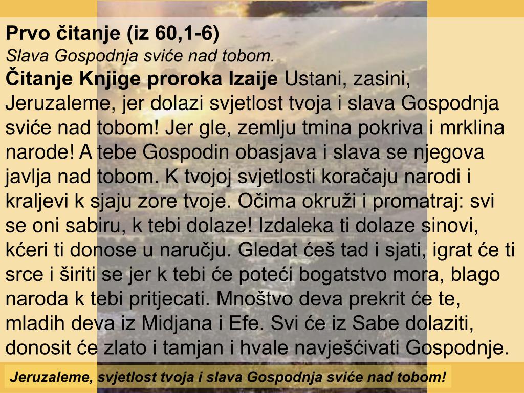 Prvo čitanje (iz 60,1-6) Slava Gospodnja sviće nad tobom. Čitanje Knjige proroka Izaije Ustani, zasini, Jeruzaleme, jer dolazi svjetlost tvoja i slava Gospodnja sviće nad tobom! Jer gle, zemlju tmina pokriva i mrklina narode! A tebe Gospodin obasjava i slava se njegova javlja nad tobom. K tvojoj svjetlosti koračaju narodi i kraljevi k sjaju zore tvoje. Očima okruži i promatraj: svi se oni sabiru, k tebi dolaze! Izdaleka ti dolaze sinovi, kćeri ti donose u naručju. Gledat ćeš tad i sjati, igrat će ti srce i širiti se jer k tebi će poteći bogatstvo mora, blago naroda k tebi pritjecati. Mnoštvo deva prekrit će te, mladih deva iz Midjana i Efe. Svi će iz Sabe dolaziti, donosit će zlato i tamjan i hvale navješćivati Gospodnje. Jeruzaleme, svjetlost tvoja i slava Gospodnja sviće nad tobom!