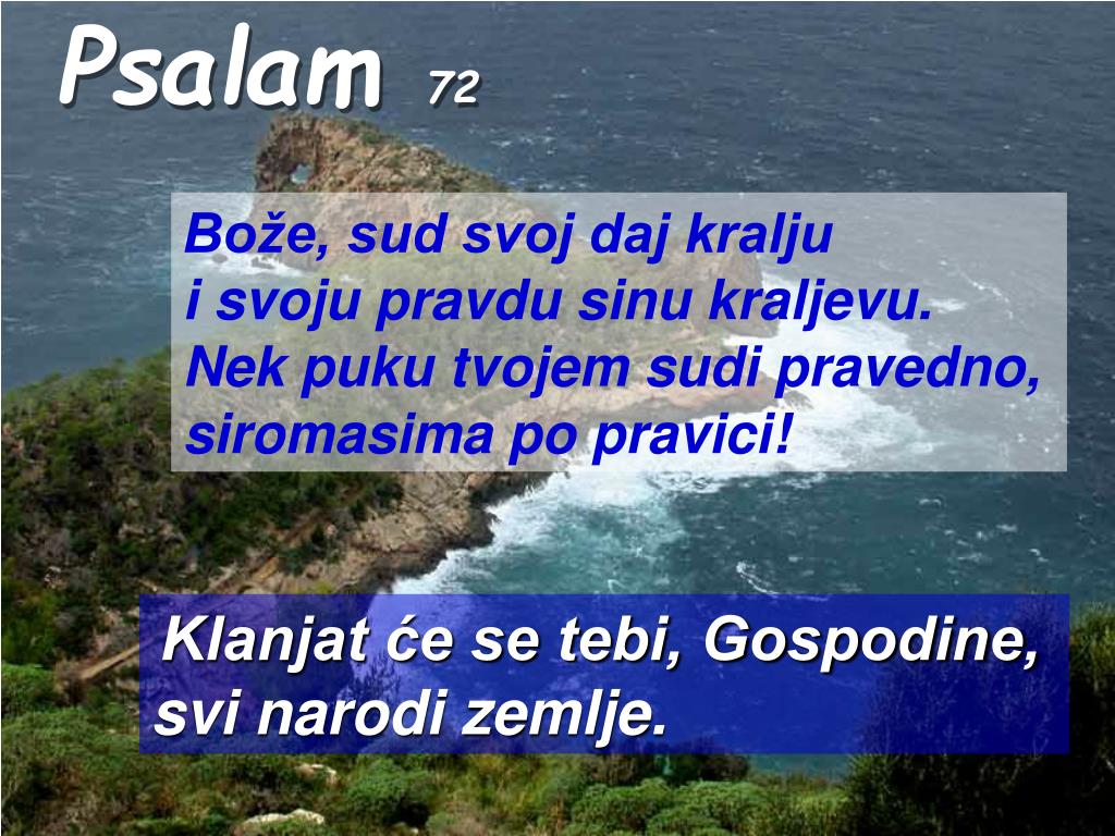 Psalam 72 Bože, sud svoj daj kralju i svoju pravdu sinu kraljevu. Nek puku tvojem sudi pravedno, siromasima po pravici! Klanjat će se tebi, Gospodine, svi narodi zemlje.