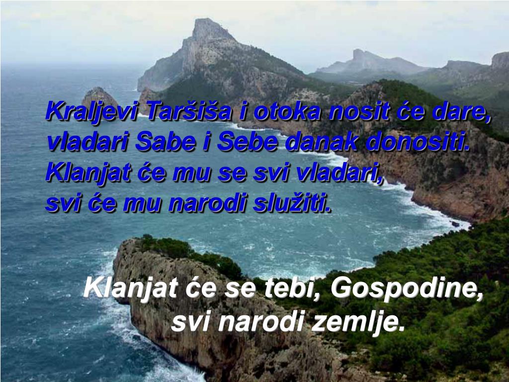 Kraljevi Taršiša i otoka nosit će dare, vladari Sabe i Sebe danak donositi. Klanjat će mu se svi vladari, svi će mu narodi služiti. Klanjat će se tebi, Gospodine, svi narodi zemlje.