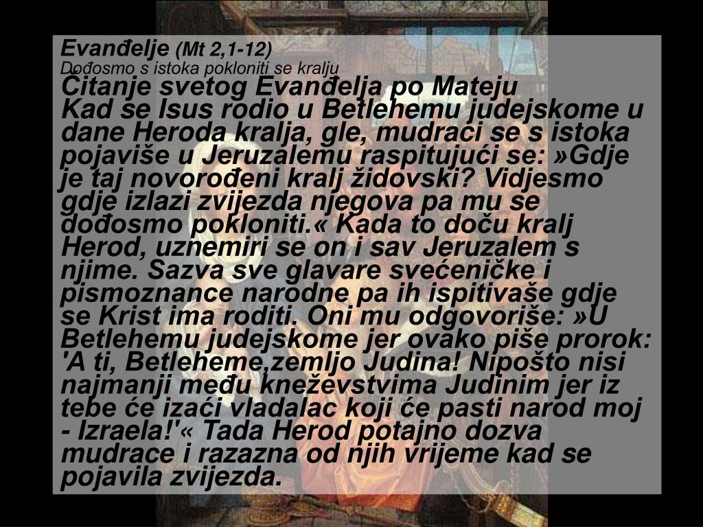 Evanđelje (Mt 2,1-12) Dođosmo s istoka pokloniti se kralju Čitanje svetog Evanđelja po Mateju Kad se Isus rodio u Betlehemu judejskome u dane Heroda kralja, gle, mudraci se s istoka pojaviše u Jeruzalemu raspitujući se: »Gdje je taj novorođeni kralj židovski? Vidjesmo gdje izlazi zvijezda njegova pa mu se dođosmo pokloniti.« Kada to doču kralj Herod, uznemiri se on i sav Jeruzalem s njime. Sazva sve glavare svećeničke i pismoznance narodne pa ih ispitivaše gdje se Krist ima roditi. Oni mu odgovoriše: »U Betlehemu judejskome jer ovako piše prorok: 'A ti, Betleheme,zemljo Judina! Nipošto nisi najmanji među kneževstvima Judinim jer iz tebe će izaći vladalac koji će pasti narod moj - Izraela!'« Tada Herod potajno dozva mudrace i razazna od njih vrijeme kad se pojavila zvijezda.