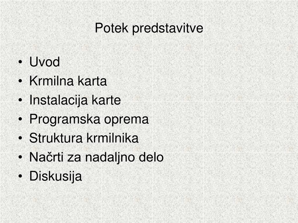 Potek predstavitve • Uvod • Krmilna karta • Instalacija karte • Programska oprema • Struktura krmilnika • Načrti za nadaljno delo • Diskusija
