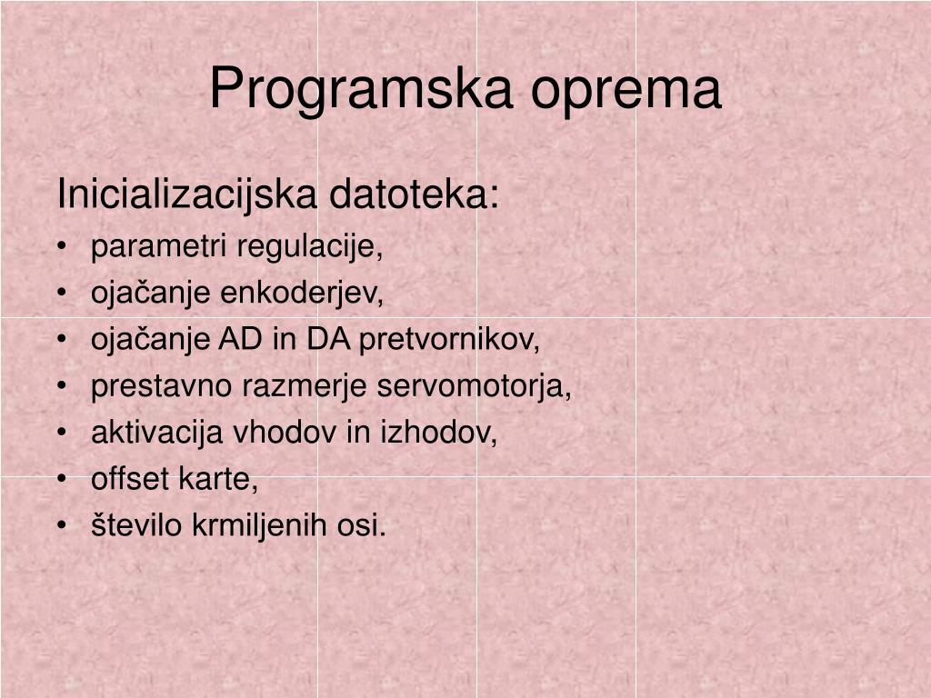 Programska oprema Inicializacijska datoteka: • parametri regulacije, • ojačanje enkoderjev, • ojačanje AD in DA pretvornikov, • prestavno razmerje servomotorja, • aktivacija vhodov in izhodov, • offset karte, • število krmiljenih osi.