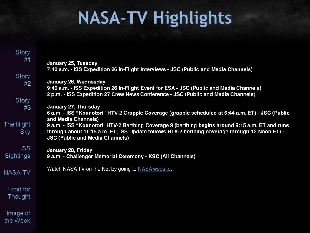 NASA-TV Highlights January 25, Tuesday7:40 a.m. - ISS Expedition 26 In-Flight Interviews - JSC (Public and Media Channels)January 26, Wednesday9:40 a.m. - ISS Expedition 26 In-Flight Event for ESA - JSC (Public and Media Channels)2 p.m. - ISS Expedition 27 Crew News Conference - JSC (Public and Media Channels)January 27, Thursday6 a.m. - ISS “Kounotori” HTV-2 Grapple Coverage (grapple scheduled at 6:44 a.m. ET) - JSC (Public and Media Channels)9 a.m. - ISS “Kounotori: HTV-2 Berthing Coverage 9 (berthing begins around 9:15 a.m. ET and runs through about 11:15 a.m. ET; ISS Update follows HTV-2 berthing coverage through 12 Noon ET) - JSC (Public and Media Channels)January 28, Friday9 a.m. - Challenger Memorial Ceremony - KSC (All Channels) Watch NASA TV on the Net by going to NASA website.