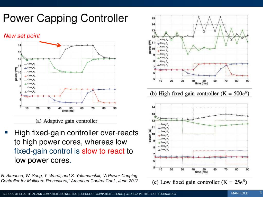 Power Capping Controller New set point • High fixed-gain controller over-reacts to high power cores, whereas low fixed-gain control is slow to react to low power cores. N. Almoosa, W. Song, Y. Wardi, and S. Yalamanchili, “A Power Capping Controller for Multicore Processors,” American Control Conf., June 2012.
