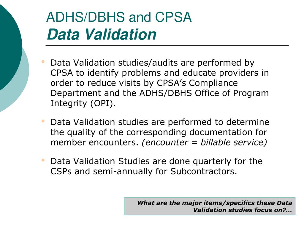 ADHS/DBHS and CPSAData Validation What are the major items/specifics these Data Validation studies focus on?… • Data Validation studies/audits are performed by CPSA to identify problems and educate providers in order to reduce visits by CPSA’s Compliance Departmentand the ADHS/DBHS Office of Program Integrity (OPI). • Data Validation studies are performed to determine the quality of the corresponding documentation for member encounters. (encounter = billable service) • Data Validation Studies are done quarterly for the CSPs and semi-annually for Subcontractors.