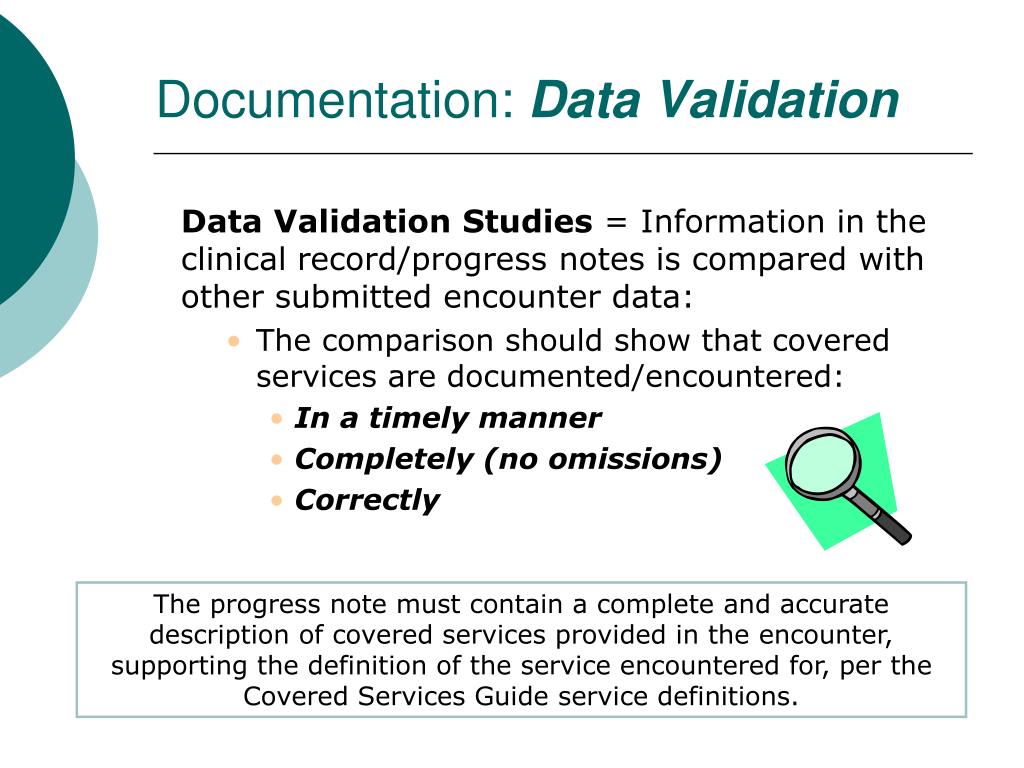 Documentation: Data Validation The progress note must contain a complete and accurate description of covered services provided in the encounter, supporting the definition of the service encountered for, per the Covered Services Guide service definitions. Data ValidationStudies = Information in the clinical record/progress notes is compared with other submitted encounter data: • The comparison should show that covered services are documented/encountered: • In a timely manner • Completely (no omissions) • Correctly