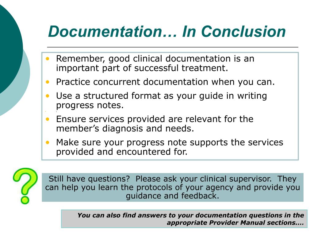 Documentation… In Conclusion • Remember, good clinical documentation is an important part of successful treatment. • Practice concurrent documentation when you can. • Use a structured format as your guide in writing progress notes. • \ • Ensure services provided are relevant for the member’s diagnosis and needs. • Make sure your progress note supports the services provided and encountered for. Still have questions? Please ask your clinical supervisor. They can help you learn the protocols of your agency and provide you guidance and feedback. You can also find answers to your documentation questions in the appropriate Provider Manual sections.…