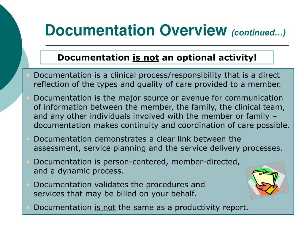 Documentation Overview (continued…) Documentation is not an optional activity! • Documentation is a clinical process/responsibility that is a direct reflection of the types and quality of care provided to a member. • Documentation is the major source or avenue for communication of information between the member, the family, the clinical team, and any other individuals involved with the member or family – documentation makes continuity and coordination of care possible. • Documentation demonstrates a clear link between the assessment, service planning and the service delivery processes. • Documentation is person-centered, member-directed, and a dynamic process. • Documentation validates the procedures and services that may be billed on your behalf. • Documentation is not the same as a productivity report.