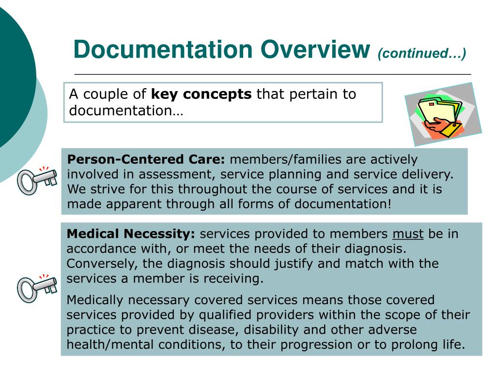 Documentation Overview (continued…) A couple of keyconcepts that pertain to documentation… Person-Centered Care: members/families are actively involved in assessment, service planning and service delivery. We strive for this throughout the course of services and it is made apparent through all forms of documentation! Medical Necessity: services provided to members must be in accordance with, or meet the needs of their diagnosis. Conversely, the diagnosis should justify and match with the services a member is receiving. Medically necessary covered services means those covered services provided by qualified providers within the scope of their practice to prevent disease, disability and other adverse health/mental conditions, to their progression or to prolong life.