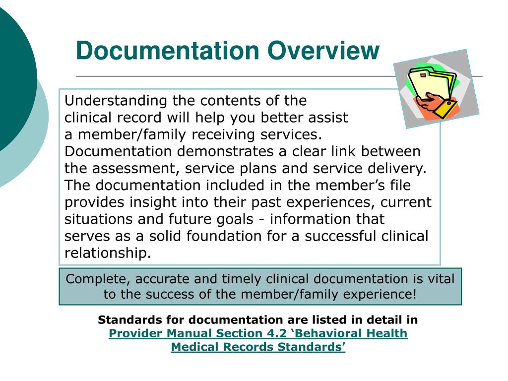 Documentation Overview Understanding the contents of the clinical record will help you better assist a member/family receiving services. Documentation demonstrates a clear link between the assessment, service plans and service delivery. The documentation included in the member’s file provides insight into their past experiences, current situations and future goals - information that serves as a solid foundation for a successful clinical relationship. Complete, accurate and timely clinical documentation is vital to the success of the member/family experience! Standards for documentation are listed in detail in Provider Manual Section 4.2 ‘Behavioral Health Medical Records Standards’