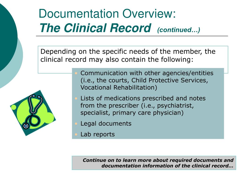 Documentation Overview: The Clinical Record (continued…) Depending on the specific needs of the member, the clinical record may also contain the following: • Communication with other agencies/entities (i.e., the courts, Child Protective Services, Vocational Rehabilitation) • Lists of medications prescribed and notes from the prescriber (i.e., psychiatrist, specialist, primary care physician) • Legal documents • Lab reports Continue on to learn more about required documents and documentation information of the clinical record…