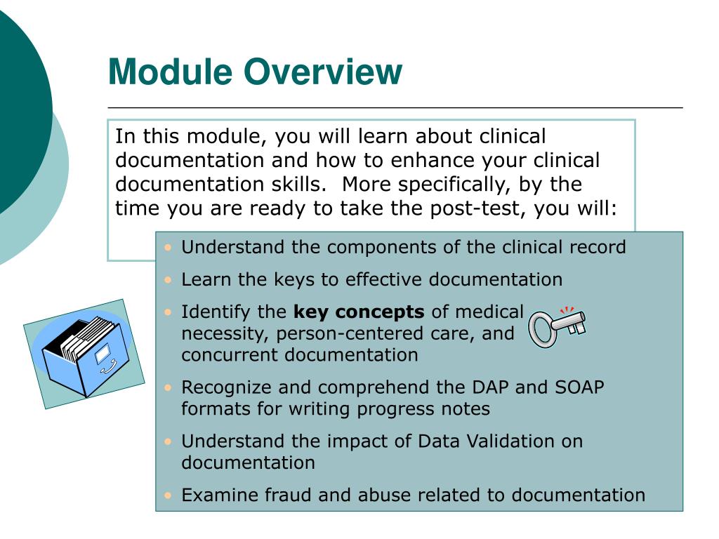 Module Overview In this module, you will learn about clinical documentation and how to enhance your clinical documentation skills. More specifically, by the time you are ready to take the post-test, you will: • Understand the components of the clinical record • Learn the keys to effective documentation • Identify the key concepts of medical necessity, person-centered care, and concurrent documentation • Recognize and comprehend the DAP and SOAP formats for writing progress notes • Understand the impact of Data Validation on documentation • Examine fraud and abuse related to documentation