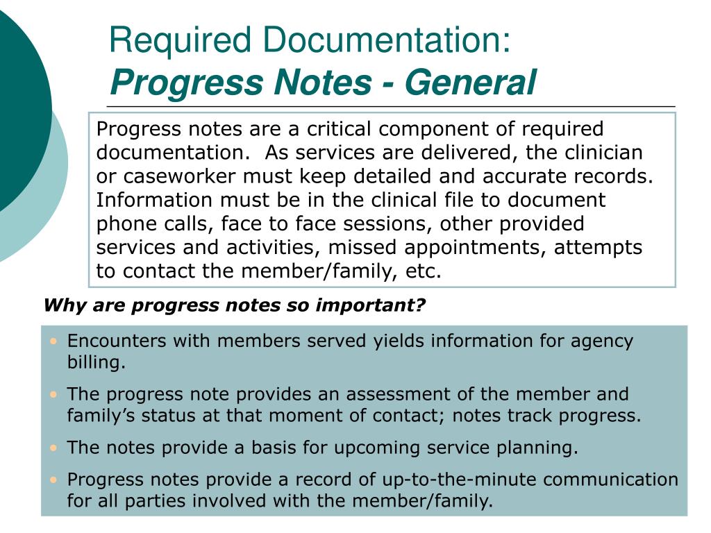 Required Documentation: Progress Notes - General Progress notes are a critical component of required documentation. As services are delivered, the clinician or caseworker must keep detailed and accurate records. Information must be in the clinical file to document phone calls, face to face sessions, other provided services and activities, missed appointments, attempts to contact the member/family, etc. Why are progress notes so important? • Encounters with members served yields information for agency billing. • The progress note provides an assessment of the member and family’s status at that moment of contact; notes track progress. • The notes provide a basis for upcoming service planning. • Progress notes provide a record of up-to-the-minute communication for all parties involved with the member/family.